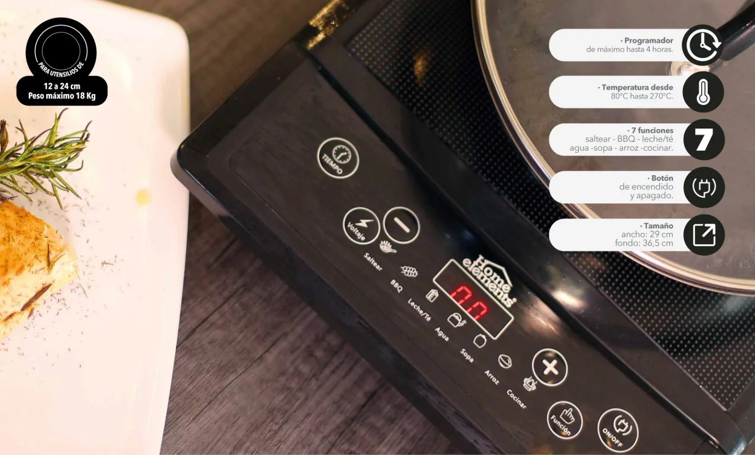 - 7 funciones: Saltear, BBQ, Leche/Té, Agua, Sopa, Arroz y Cocinar.